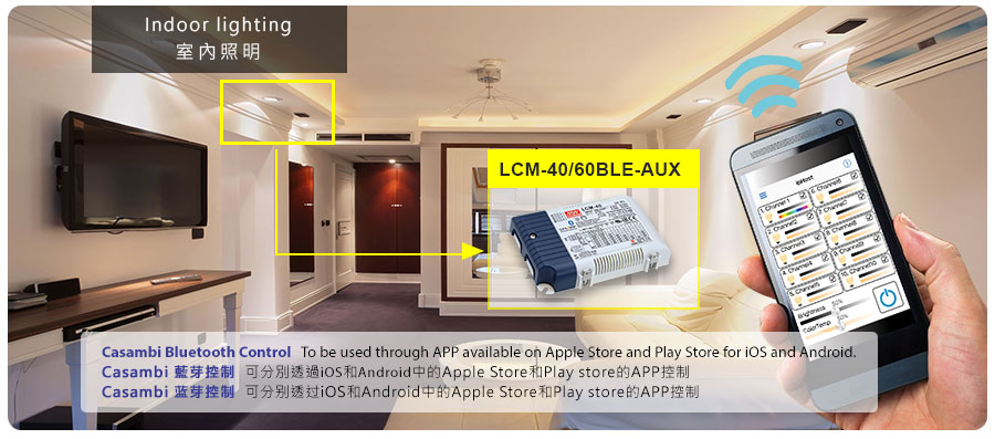 明纬采用欧洲厂商CASAMBI的蓝芽连网模块,结合LCM-40/60-BLE两种瓦数做电源设计,可搭配任何室内及商业用照明灯具做使用,让用户可轻松搭配APP软件做蓝芽连网控制。用户下载APP软件后可以透过手机或平板计算机做初期的设定,包含群组设定、场景明暗设定及定时开关设定等。这些功能都只要透过APP做简单的设定就可以达成,并可搭配CASAMBI相关周边的墙面开关及传感器来做延伸使用,可以让照明控制更佳智能化。
