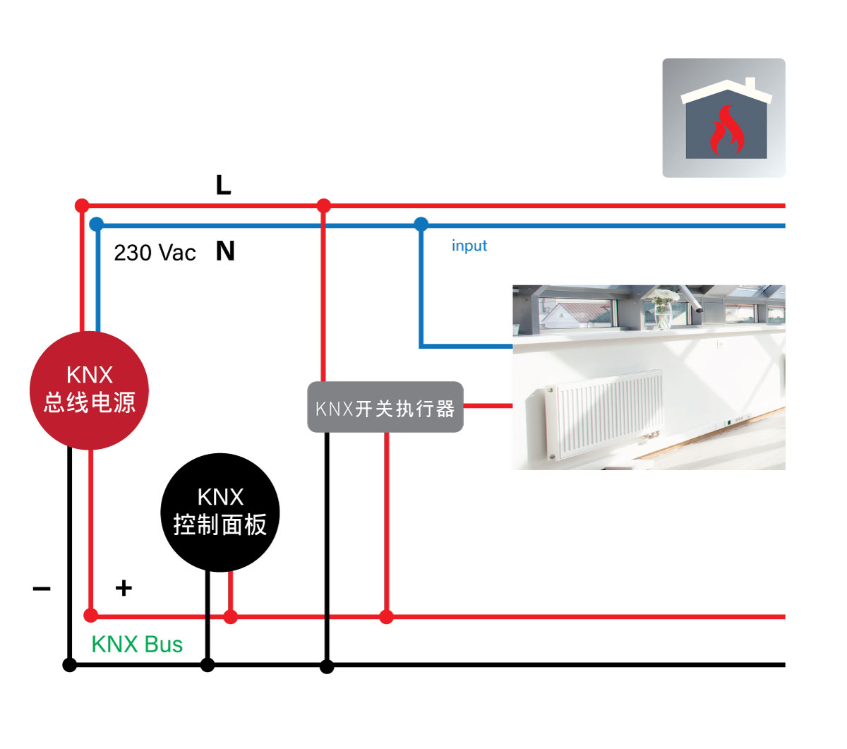 暖气系统是智慧建筑控制的一环,利用感测器测量办公室或是特定室内空间的温度数值,藉由逻辑控制器对所侦测的室内温度数值做出判断控制暖气系统,进而对室内温度作调节。明纬因应此一市场应用,开发KNX总线电源供应器 KNX-20E 及KNX-40E提供KNX 设备电源 。KNX逻辑开关执行器则有KAA-8R,可以控制热回路、开关散热片与地暖分配器上的电热调节器。根据设备型号和参数设置,可透过开关调节参数或脉宽调节(PWM)的机制,不仅适用於私人住宅,也同样适合用作商业用途的楼宇,例如办公楼、学校和酒店。