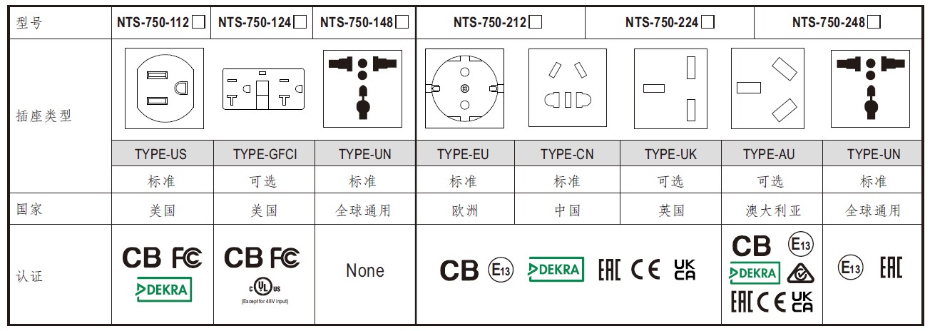 表2显示不同的AC输出插座以及相对应的合适国家与认证;使用者可以根据其需求选择合适的型号。
