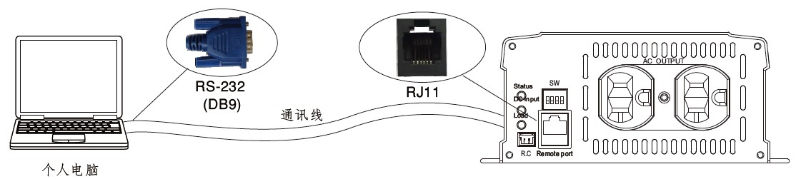 如图2所示,可透过RS-232/RJ11的传输线连接PC与逆变器,读取逆变器的内部数据。