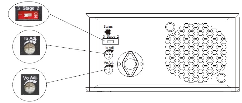 如图3与图4所示,可透过指拨开关设定2或3段充电曲线,出厂设定为3段。另外也可透过Vo Adj调设充电电压,Io Adj调设充电电流。