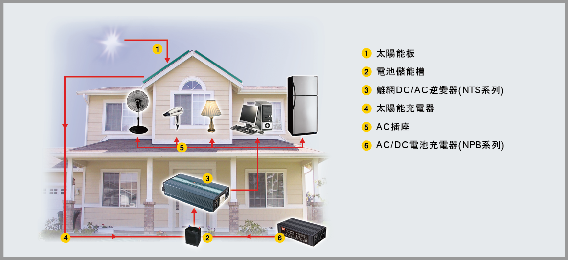 如图5所示,应用于家用智能供电系统为例,当市电供电正常时,所有家用电器使用市电运转,同时NPB充电器可对储能蓄电池充电;一旦出现短暂停电状况,储能蓄电池与NTS-1200可转换产生交流电,在一定时间内维持家用电器运转。若房屋搭配太阳能板,这套供电系统白天可透过屋顶的太阳能板将太阳能转换为直流电,用于对储能蓄电池充电并同时透过NTS逆变器转换的交流电满足部分家用电器用电。在夜间失去太阳能来源后,储能蓄电池可透过逆变器转换交流电以满足家用电器夜间使用,整套智能供电系统既节能又环保。