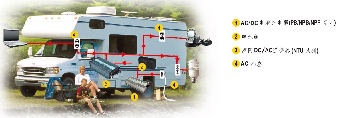如图7所示,以NPB-360+电池组+NTU-1200配置于露营车上并配置有AC输入插头,AC输入插头可进行AC 直接供电(bypass)与提供充电器电源对电池充电,当露营车停在有设置AC插座的营地,用户可以直接把露营车AC插头插上,此时露营车上连接NTU-1200输出的设备电力会由市电供电;当露营车开到没有AC插座的营地或是车辆移动中,则露营车上的设备电力转由电池与NTU-1200转换提供。